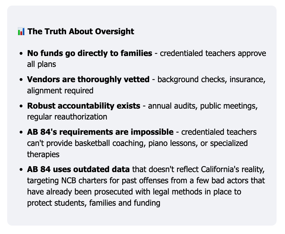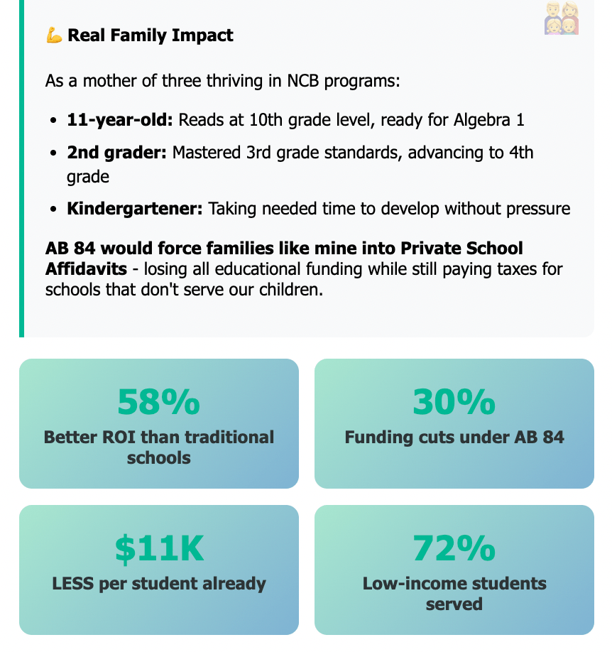 Students are thriving with personalized learning options provided by non-classroom base (NCB) charters – but AB 84 would strip away the funding that makes their education possible. The facts are clear: Charter schools deliver better results for less money, especially for marginalized students. Yet AB 84 punishes success while protecting failure. Section 44 of the bill creates an illegal double standard – traditional schools can use outside vendors without requiring these vendors hold CA teaching credentials, but charter families can’t access the same flexibility.